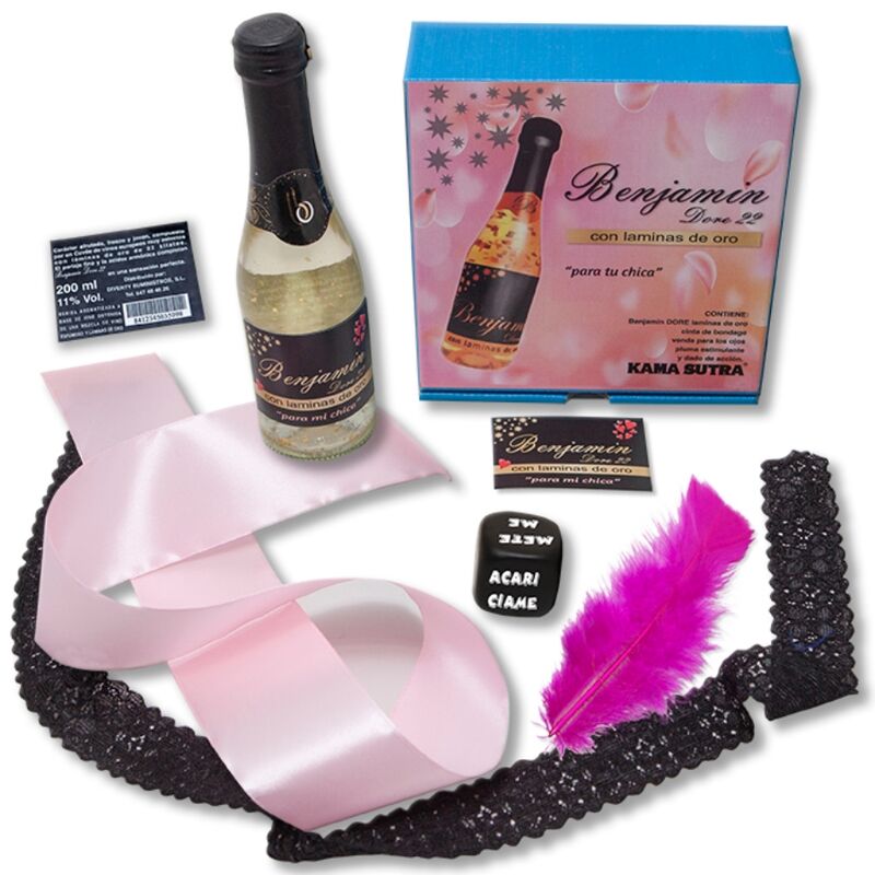 ESTUCHE con un CAVA BENJAMIN DORE CON BAÑOS DE ORO DE 22 KILATOS de carácter afrutado, fresco y joven, compuesto por un vino espumoso CON BAÑOS DE ORO DE 22 KILATOS muy selecto PARA TU CHICA.