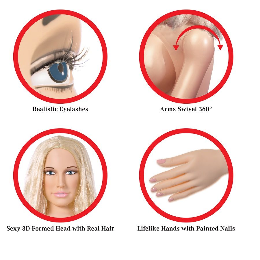 Esta increíble muñeca inflable de tamaño real fue diseñada meticulosamente con características realistas para una experiencia verdaderamente realista. Su atractivo rostro moldeado en 3D está rematado con una exuberante cabellera que invita a ser recogida. Con sus firmes pechos, podrás disfrutar de sus pezones súper suaves y reales. Su vagina y trasero son firmes y muy realistas.