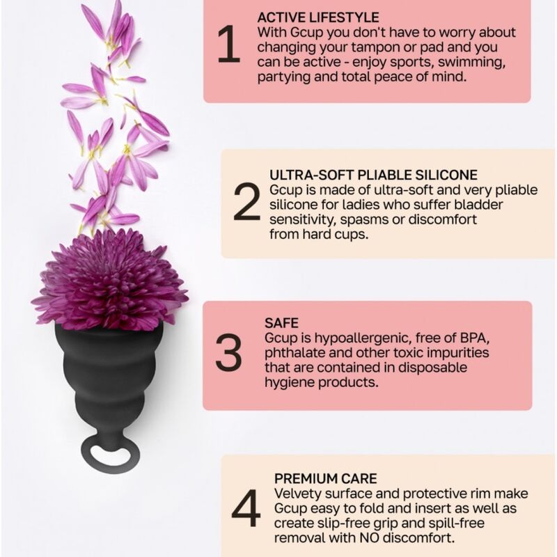 La principal ventaja e innovación de la copa menstrual Gcup reside en su estructura interna. Dentro del recipiente hay una válvula antirretorno que impide que el líquido se escape. La copa menstrual Gcup tiene forma de campana, lo que facilita su uso.